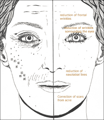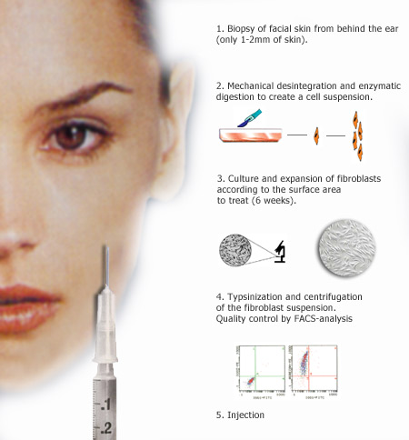 First surgical procedure: Skin biopsy Location: behind the ear Dimension: 1 cylinder of 3 mm in diameter Transport: in sterile medium provided by the laboratory Subsequent procedures: Frequency of the injections: it will depend on the number and size of the defect to treat. The number of the injections which are performed in intervals of 2 weeks is variable. Transport of the cells: 15 minutes before the injection, the cell suspension is taken out of the transport-box to reach room temperature, all under strict sterile conditiones. Injection of the cells: via insulin syringe with a 27 G needle. Basic principles || The culture of autologous fibroblasts represents an important advancement as a repair system for the skin. The use of fibroblasts, cells which produce collagen type I, is one of the treatments of major endurance available at the moment to reduce facial, nasolabial and perioral lines, subcutaneous atrophy, as well as secondary irregularities caused by acne and scars. The injection of cultured fibroblasts into the area of treatment causes the production of new collagen and gives consequently natural elasticity and skin volume and provides a physiologic material for the long term and complete repair of skin. In the year 2000 a total of 1,450 patients in the USA and Europe were treated in specialized centres.These procedures included a total of 4,800 applied injections. The report from two university centers: the Dentistry of New Jersey and the Hackensack University Medical Center described the results in 94 patients who were treated between the years 1995 and 1999 with long-term follow-up which ranged from 36 to 48 months. The results showed that 92% of the patients were satisfied with the reconstruction and the long term monitoring revealed continuous improvement. Therefore, it is proposed that the culture of autologous fibroblasts represents a valid and modern alternative for the definitive and physiological correction of dermal lesions. |