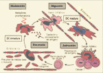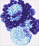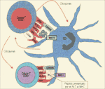 El receptor de células T (RcT) y el complejo dímero de cadenas a y b reconocen un péptido específico que se hospeda en el hueco específico de la molécula MHC. Esta interacción determina especificidad inmunológica. Las moléculas más seriamente involucradas incluyen CD80 y CD86 expresadas sobre las CD. Estas son los ligandos del CD28 sobre las células T. Se establece un ciclo de mutua estimulación entre las CD y las células T. En el caso de células T “helper” CD4+, una importante molécula adicional de superficie es el ligando CD40 (LCD40). La regulación del LCD40 sobre las células T conduce a una activación adicional de CD a través de la interacción LCD40-CD40. El LCD40 se requiere para una óptima activación de células T CD8+ por las CD. << pag. 1 |